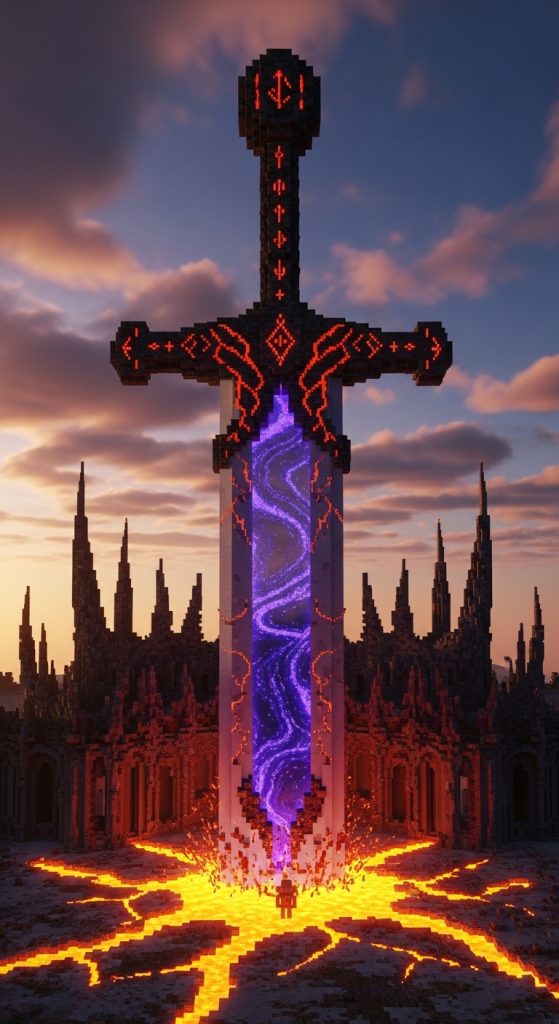 Imagine a colossal sword stabbed into the earth — and the portal forms the blade’s core. This design is both dramatic and symbolic, as if the sword tore open reality itself.