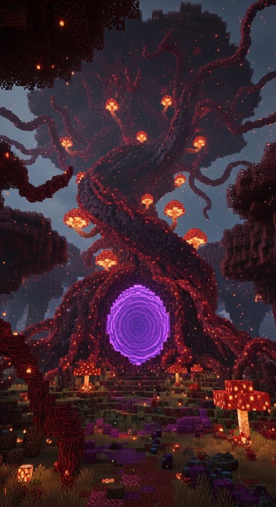 Use warped stems, crimson planks, and crying obsidian roots spreading into the ground. Glow shroomlights inside the trunk to illuminate the purple portal light.