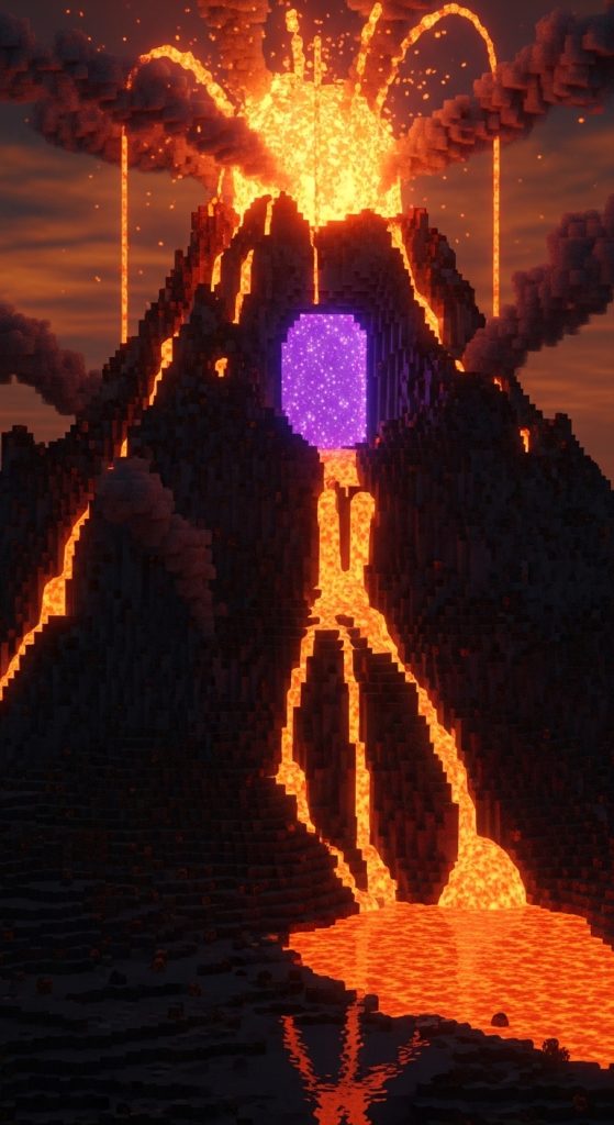 A volcano portal is one of the most cinematic designs you can build. Construct a towering volcanic mountain using basalt, blackstone, and deepslate, with lava streams flowing down the sides.