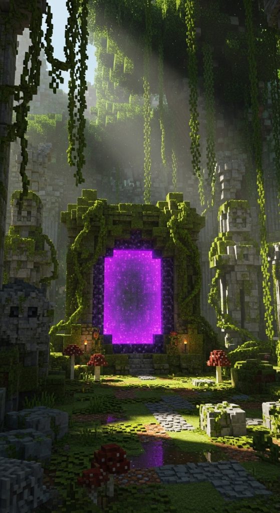 This design tells a story — perhaps an ancient civilization once used the portal and vanished. It’s perfect for lore-based survival worlds.