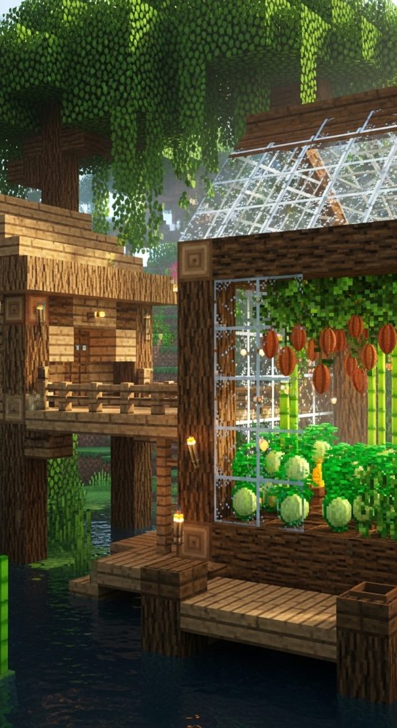 In jungle biomes, use bamboo, jungle wood, and leaves to craft a raised hut. Connect it to a humid greenhouse filled with melons, cocoa beans, and vines.