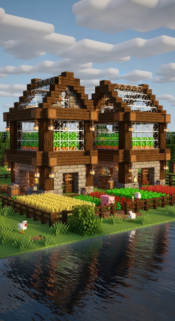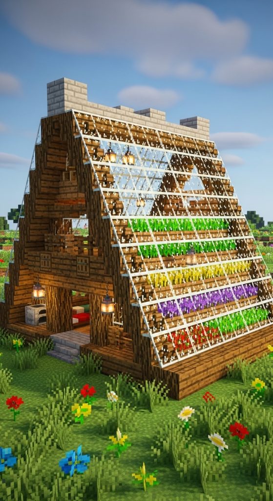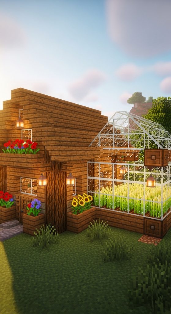 Add flower boxes under the windows, lanterns by the entrance, and rows of wheat inside the greenhouse. It feels like a peaceful farmer’s retreat—perfect for roleplay or aesthetic survival worlds.