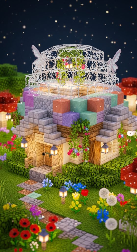 This enchanting build uses pastel blocks, flowers, and glow berries. The greenhouse is shaped like a glass dome filled with colorful crops and azalea leaves.