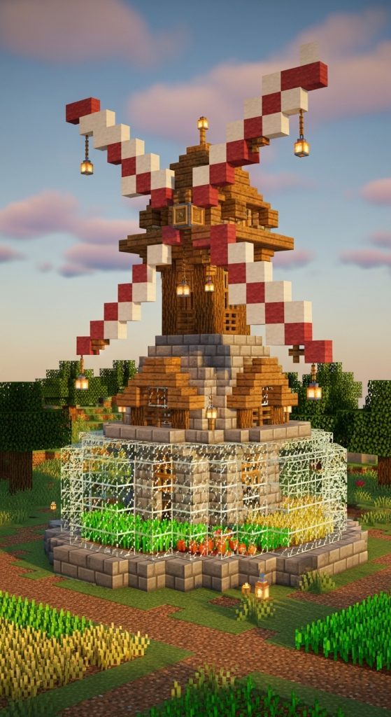 This design saves space while making your starter base look like a fully developed farm. Lanterns hanging from the windmill blades add charm at night.
