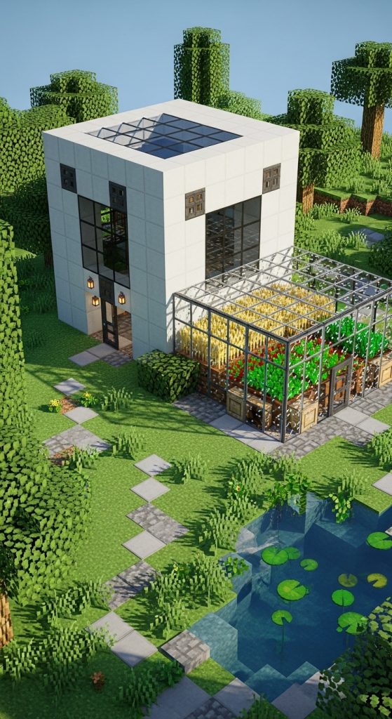 If you prefer modern aesthetics, build a small white concrete or quartz cube house. Then attach a sleek greenhouse made of glass blocks and iron trapdoors.