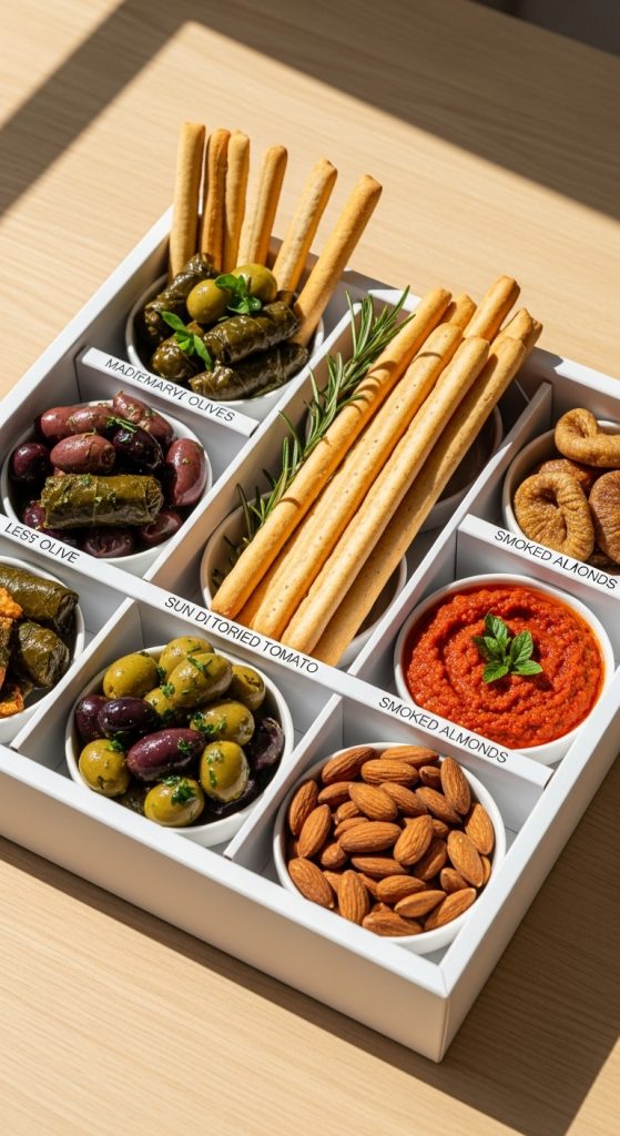 Select a theme of world flavours—e.g., Mediterranean, Japanese, Middle Eastern—or mix. For Mediterranean: marinated olives, stuffed grape leaves, tapenade, mini pita crisp, sundried tomato jam, smoked almonds, fig & honey cake, saffron-infused popcorn. For Japanese: wasabi peas, yuzu preserved citrus, smoked black bean crisps, matcha shortbread, dried seaweed snacks, premium Japanese green tea.