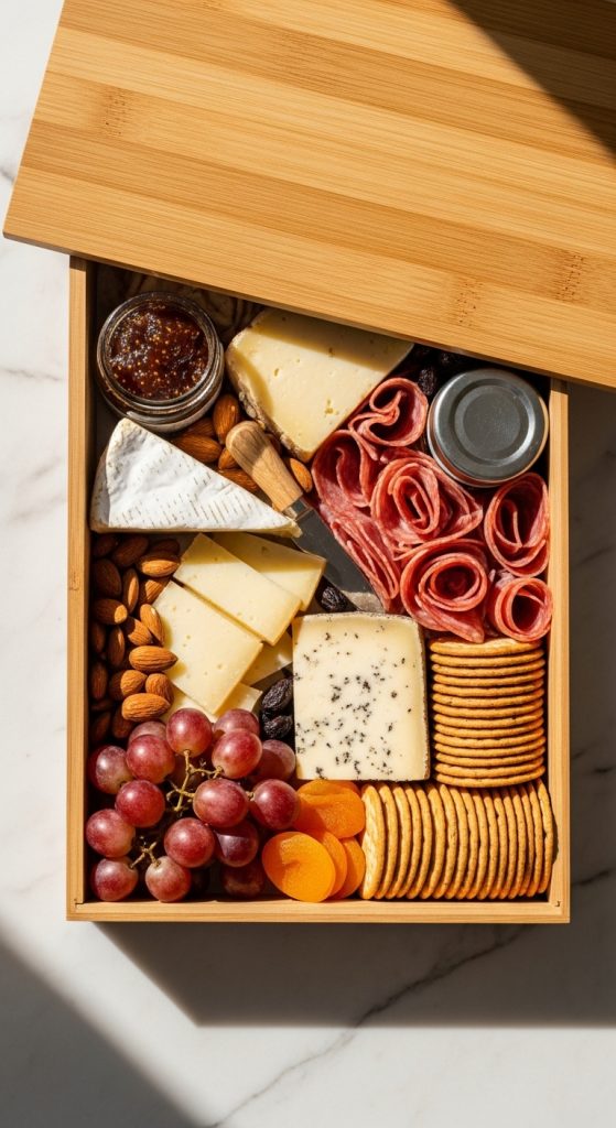 Think of a luxury wooden crate or slide-lid bamboo box. Inside: three to five premium cheeses (brie de meaux, aged manchego, truffle gouda, goat cheese log), artisanal charcuterie (prosciutto, salami, bresaola), gourmet crackers (sea-salt, rosemary, gluten-free option), fig jam or quince paste, roasted almonds or Marcona almonds, fresh and dried fruits (figs, apricots, grapes), and a mini bottle of fine olive oil or balsamic glaze.