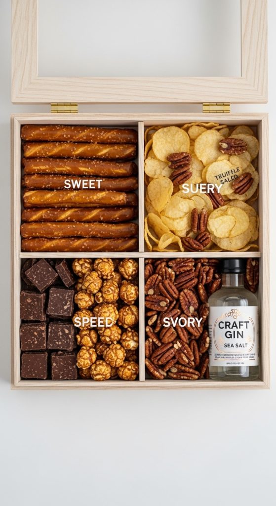 This box plays with the contrast of salty and sweet: caramelised pretzel rods, chocolate-coated popcorn, spiced pecans, parmesan crisps, dark chocolate with sea salt, honey-roasted macadamia nuts, mini jars of gourmet fruit curd, truffle-salted potato chips, and a fine bottle of craft gin or whiskey.