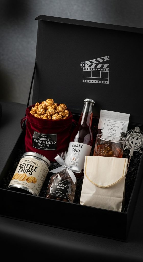 Presentation tip: Use a matte black box with film-reel graphic embossed in silver; include a USB or QR card suggesting a curated film. Add a little satin popcorn-bag for aesthetic.