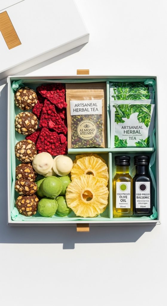 Catered for health-conscious adults who still want luxury. Use a crisp white box with bamboo accents. Inside: raw almond butter bites, freeze-dried raspberry bark, organic matcha-white chocolate clusters, dehydrated pineapple rings, dark chocolate with sea-salt and quinoa, goji-berry trail mix, artisan herbal tea sachets, a small bottle of cold-pressed olive oil & vinegar duo for drizzling.