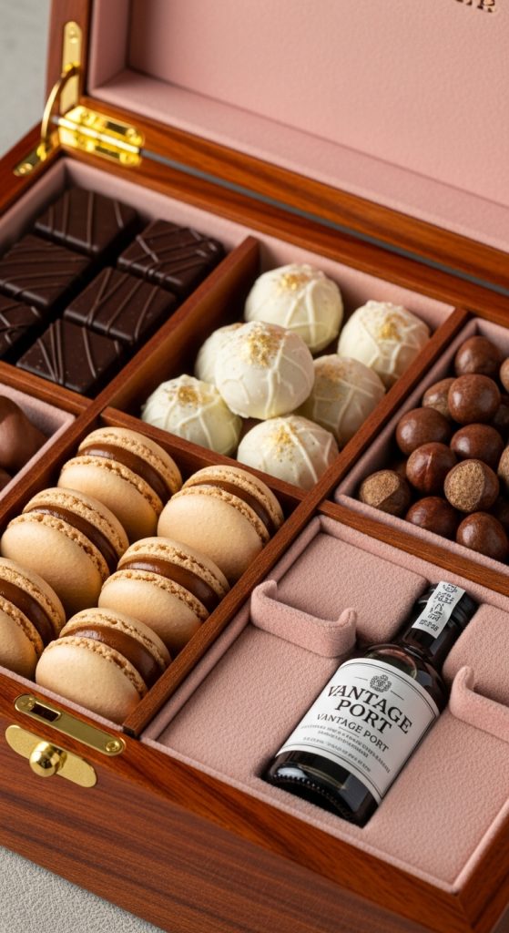 Why it works: Most adults love chocolate indulgence, and when paired with fine liqueur or port, it becomes an elevated experience rather than just “snack”.
