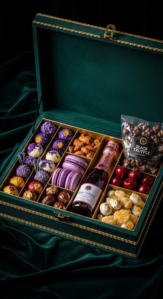 An indulgent, romantic-luxury snack box with midnight colours (navy, deep emerald, gold). Inside: edible flower-infused chocolates, violet macarons, lavender-honey roasted almonds, dark chocolate covered cherries, gold-leafed candied ginger, black-truffle popcorn, sparkling rosé mini, mini pot of gourmet honeycomb.