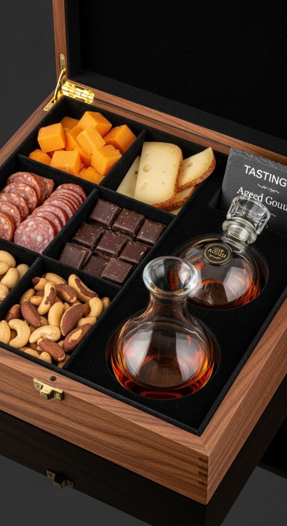 This is a high-end “cheese board meets fine spirits” box: small decanter of aged whiskey or cognac, alongside premium hard cheeses (aged cheddar, smoked gouda), artisan sausage slices, gourmet nuts (brazil, cashew), dark chocolate squares, coffee-infused truffles, charred bread crisps, gourmet pickles or fermented-veg.