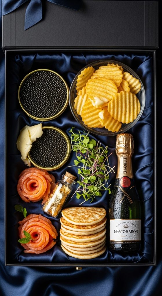 Imagine a sleek black or midnight-blue box lined in satin, with touches of gold foil. Inside: premium butter-dipped potato chips (or brand-name kettle chips), a small tin of quality caviar, blinis or crisp mini-toasts, dollops of crème fraîche, thinly sliced smoked salmon, micro-greens, edible gold leaf flakes, and a mini bottle of chilled champagne (or sparkling wine) nestled in a custom compartment.