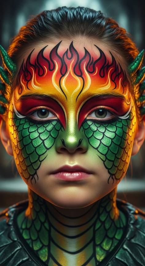 For kids who love powerful creatures, a dragon face design is bold and exciting. Flames, scales, and wings painted across the face create a dramatic look.