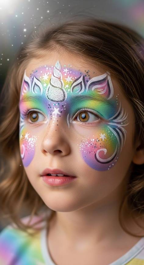Unicorns have exploded in popularity, making them one of the most requested face painting ideas. Kids love the pastel rainbow palette, glittery horns, and dreamy designs.