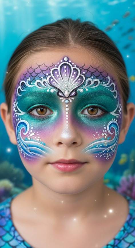 Inspired by the ocean, mermaid face painting includes shimmering scales, seashell crowns, and glittery waves. The iridescent color palette makes it stand out.