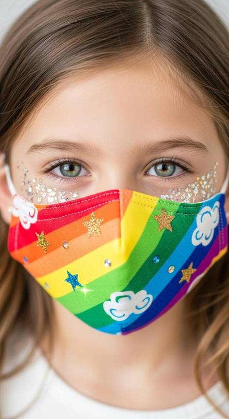 - Trendy twist: A diagonal rainbow mask with clouds, sparkles, and 3D glitter effects.